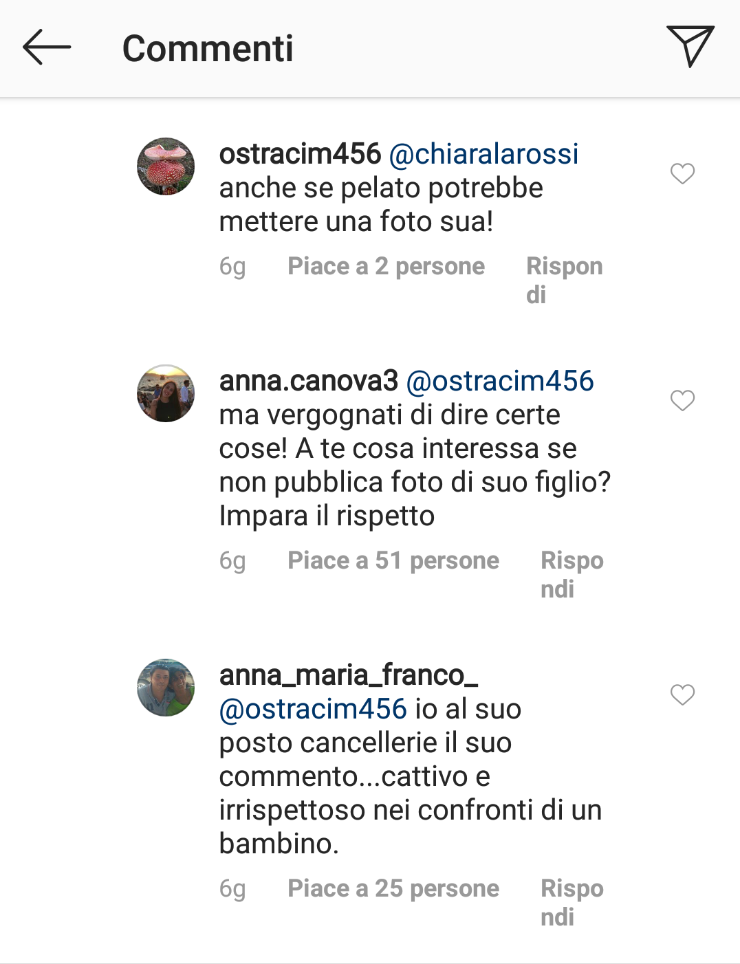 Purtroppo, spesso, si pensa di essere giustificati ad attaccare o offendere un personaggio pubblico per il solo fatto che si tratti di una celebrità. Dimentichiamo, però, che dietro lo schermo c’è una persona che conduce una vita normale, con dei problemi comuni e delle difficoltà quotidiane. Il lavoro che fa non può e non deve giustificare la maleducazione e la mancanza di rispetto. Impareremo, una volta per tutte, a comportarci sul web come ci comporteremmo nella vita di tutti i giorni? Perché dubito che qualcuno, incontrando la Santarelli per strada, le dica “Mostrami una foto di tuo figlio anche se è pelato”. E allora perché scriverglielo su Instagram?