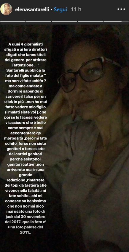 Elena, tuttavia, ne ha per tutti: attraverso le sue Instagram stories, infatti, fa sapere che è amareggiata per l’atteggiamento di alcuni giornalisti che hanno riportato uno scatto da lei pubblicato insieme al figlio Giacomo (foto, va detto, che risale a molti anni fa) e hanno scritto “Elena Santarelli mostra le foto del figlio malato”.
